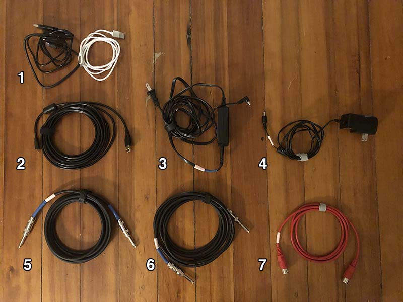 The cable kit consisted of USB A to USB C cables [5.1], a very long micro USB cable [5.2], 12V 2.5A DC power supply for the solenoids [5.3], Focusrite interface power supply [5.4], medium length 1/4" guitar cable [5.5], long 1/4" guitar cable [5.6], MIDI cable [5.7].