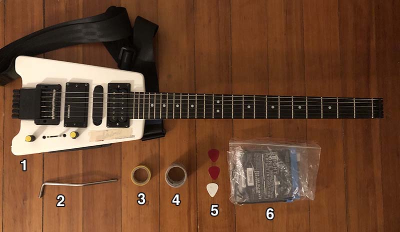 The guitar gig bag contained a Steinberger travel guitar [8.1]*, whammy bar [8.2], electrical tape [8.3], packing tape [8.4], picks [8.5], extra strings & hex keys for the guitar [8.6].